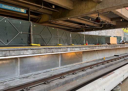 An All Weather Sound Panel can be attached to a mobility carriage, which allows a single person to move the panel easily. Multiple panels outfitted with the carriage system can be attached together, allowing a single person to move the entire assembly, as seen in these images.